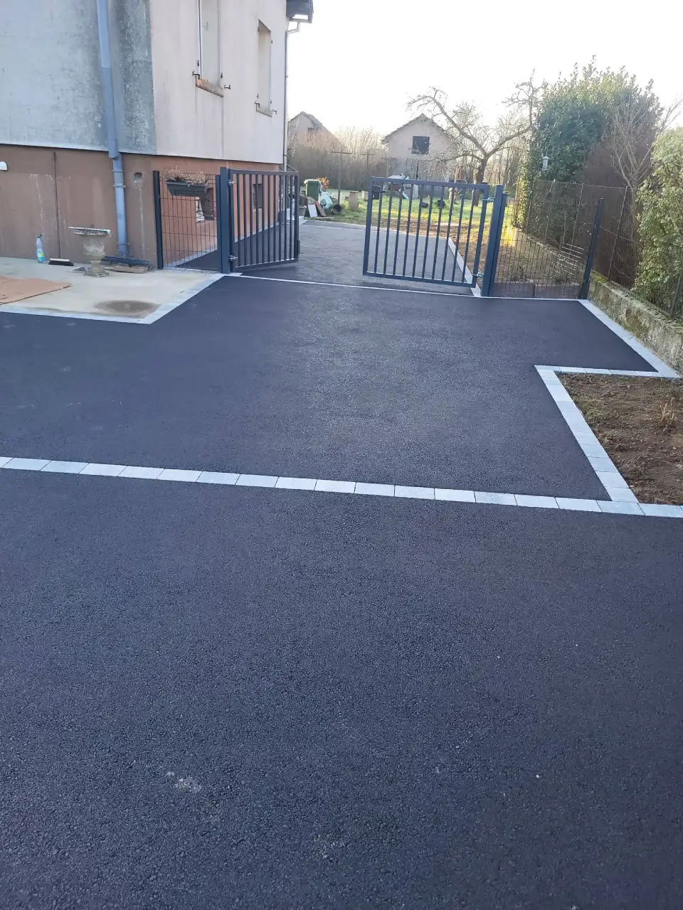 L’enrobé permet de créer des surfaces adaptées aux usages extérieurs. Il est utilisé pour les accès de maison, les cours et les zones de circulation. Cette solution combine résistance et finition soignée pour un aménagement extérieur fonctionnel.